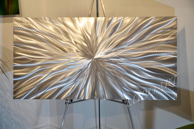 Silver metal abstract art wall clock christopher creates amazing metal art work by hand etching various metals using various grinders and sanding tools.